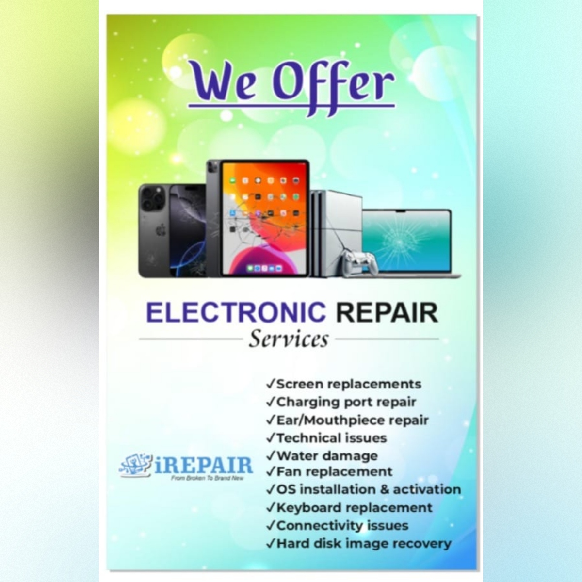 At iRepairShub, we’re dedicated to bringing your gadgets back to life with fast, reliable, and affordable repair solutions. As your trusted tech repair partner, we specialize in servicing a wide range of devices—including smartphones, tablets, laptops, and other electronics—using high-quality parts and expert techniques to ensure long-lasting results. Our experienced technicians diagnose issues quickly and provide clear, honest solutions so you can get back to what matters most without unnecessary delay.